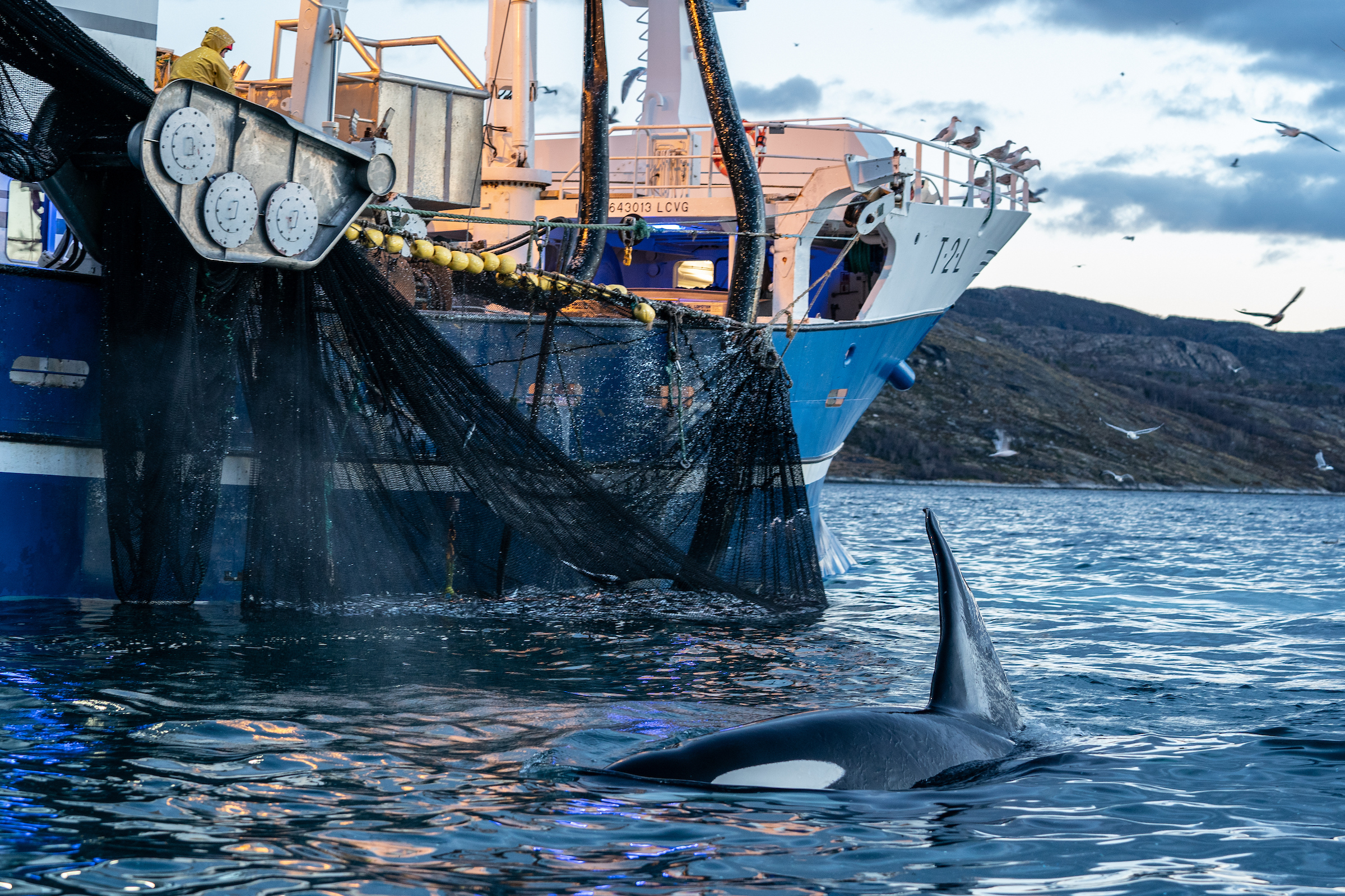 An industrial herring boat fishing in orca feeding grounds, Lofoten, Norway. Photo by Cristina Mittermeier.